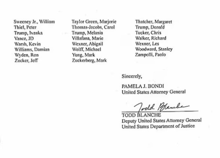 Emra të tjerë të njohur përfshijnë Robert De Niro, Diana Ross, Melinda Gates, Tucker Carlson dhe Meghan Markle. Siç shpjeguan Bondi dhe zëvendësi i saj Todd Blanche, këta individë shfaqen në dosje në një "gamë të gjerë kontekstesh".