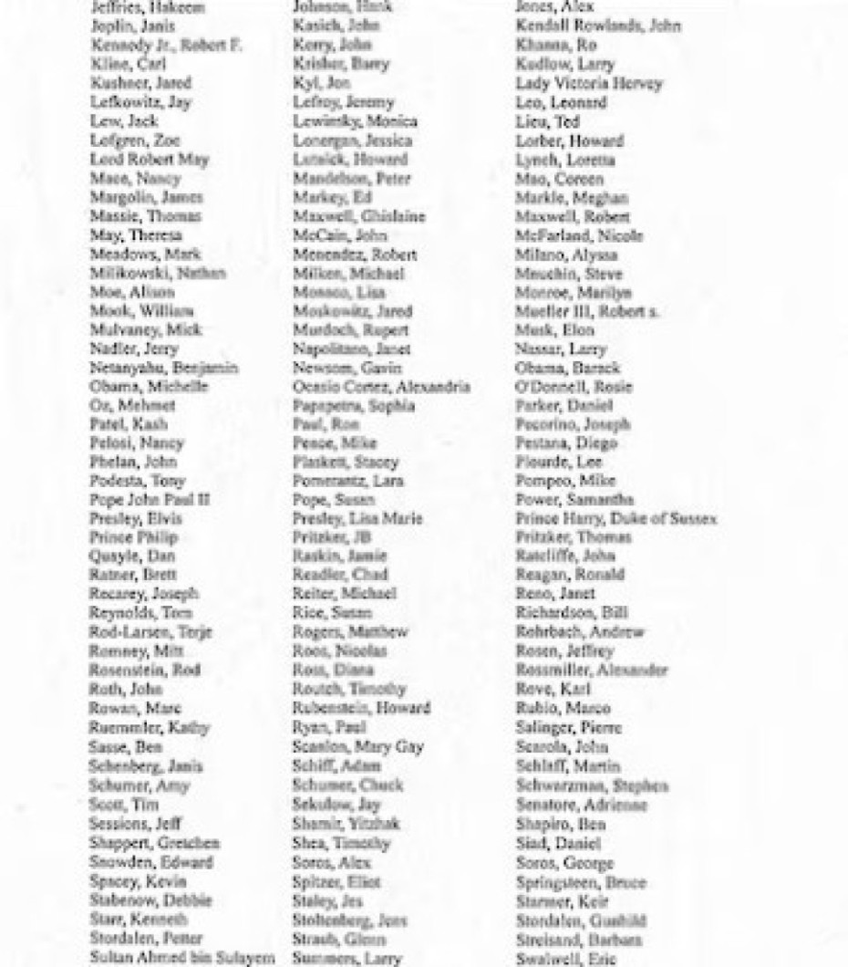 Lista përfshin këngëtarë, aktorë, biznesmenë dhe sipërmarrës, si të gjallë ashtu edhe të vdekur. Midis personazheve të famshëm të listës A të përmendur janë emra të botës së artit si Beyoncé, Cher, Kim Kardashian, Bruce Springsteen dhe Jay-Z. Po ashtu ka në të politikanë si Presidenti i SHBA-ve Donald Trump, zëvendësi i tij JD Vance, Michelle Obama, Sekretari i Shtetit Marco Rubio dhe familja Clinton.