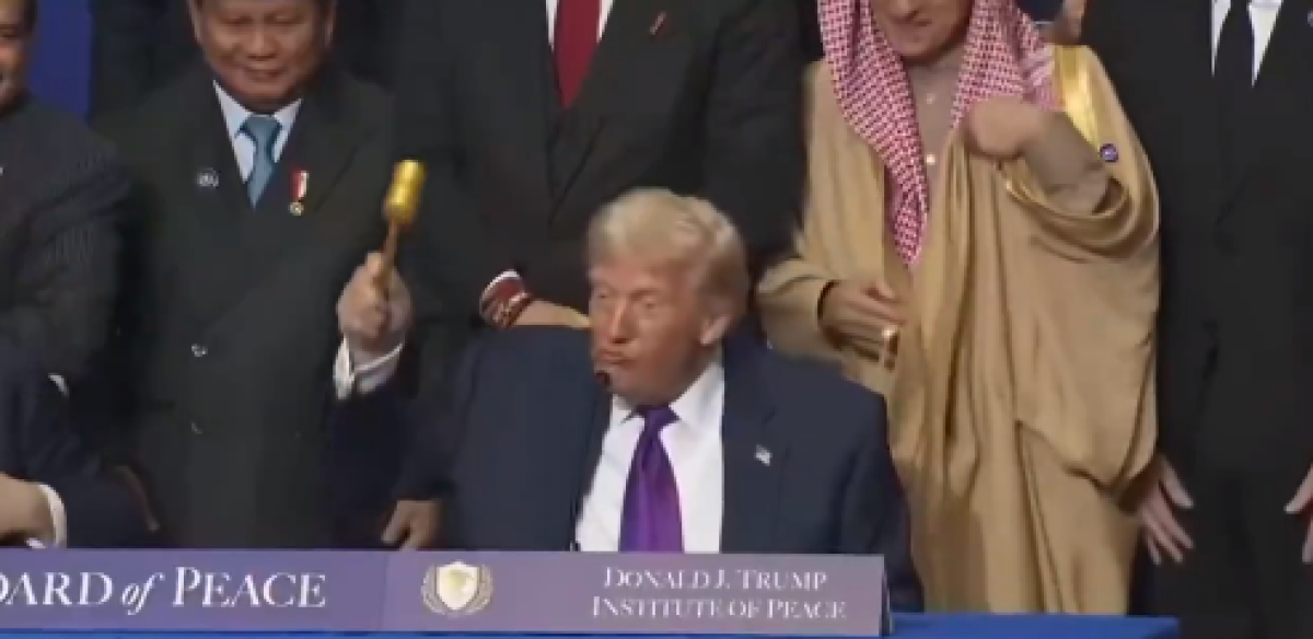 Presidenti i Shteteve të Bashkuara, Donald Trump u shfaq duke mbajtur në dorë çekiçin e artë ceremonial të “Bordit të Paqes”, duke theksuar se ai simbolizon “autoritet presidencial”. Ai e ngriti çekiçin përpara të pranishmëve, ndërsa iu drejtua zv.presidentit JD Vance me fjalët: “Le ta marrim me vete”. Çekiçi ceremonial përdoret për të hapur dhe mbyllur zyrtarisht sesionet e takimeve, por në këtë rast mori edhe një dimension politik, duke theksuar rolin udhëheqës të presidentit në këtë iniciativë.