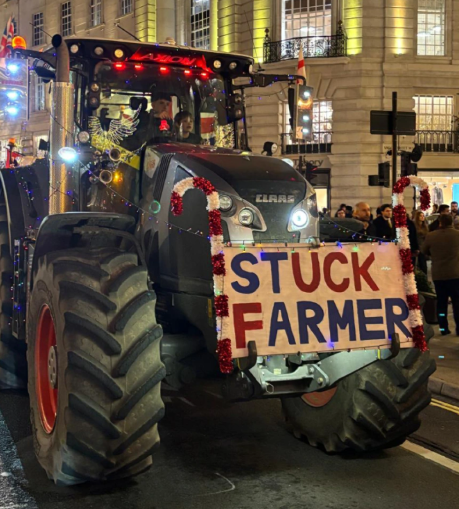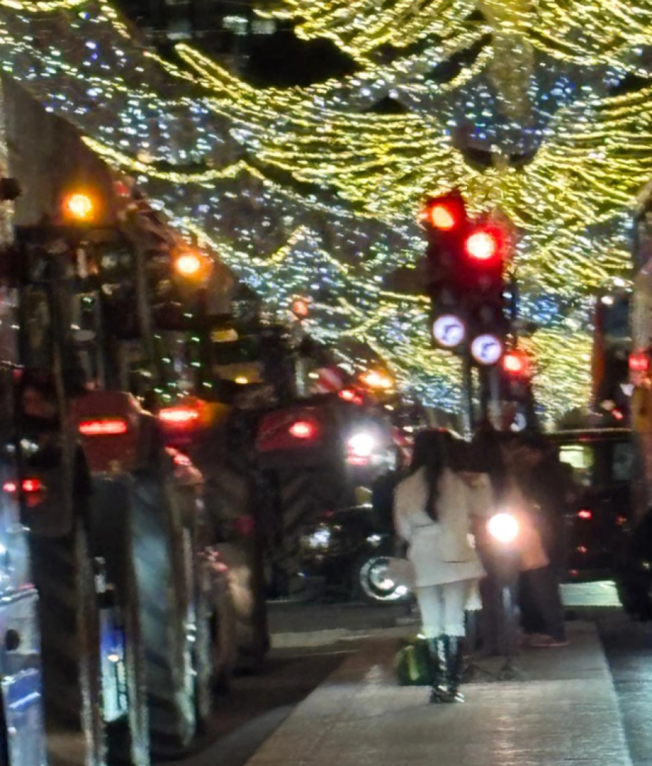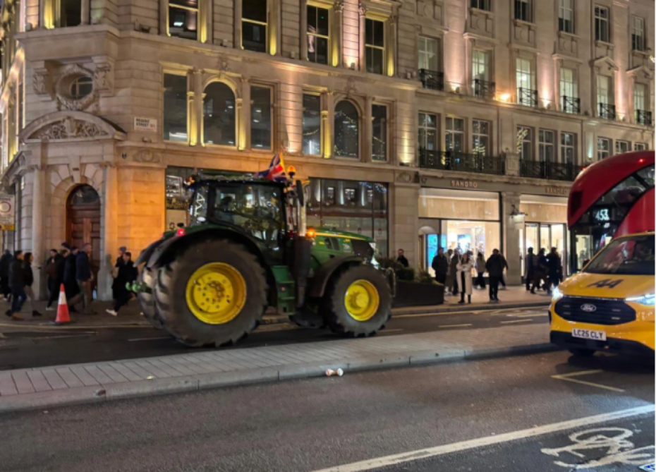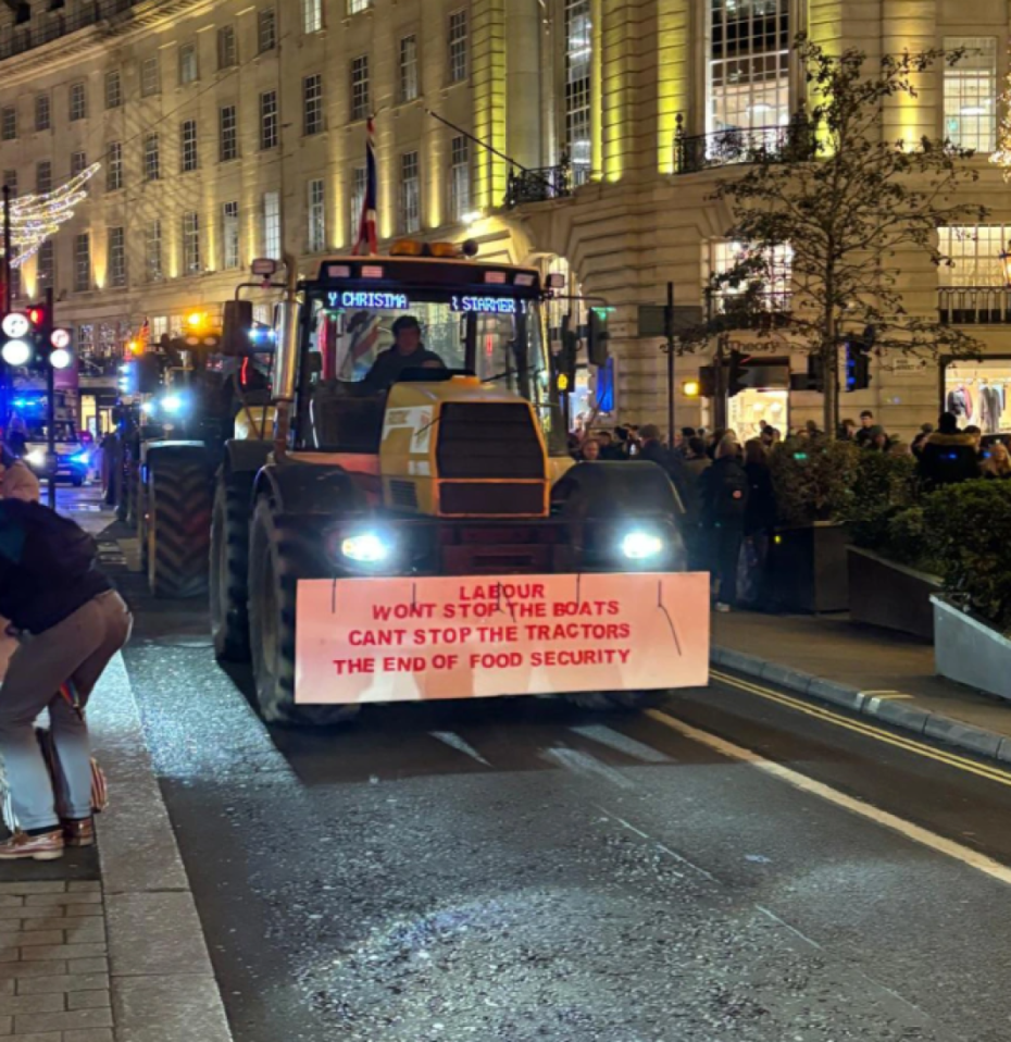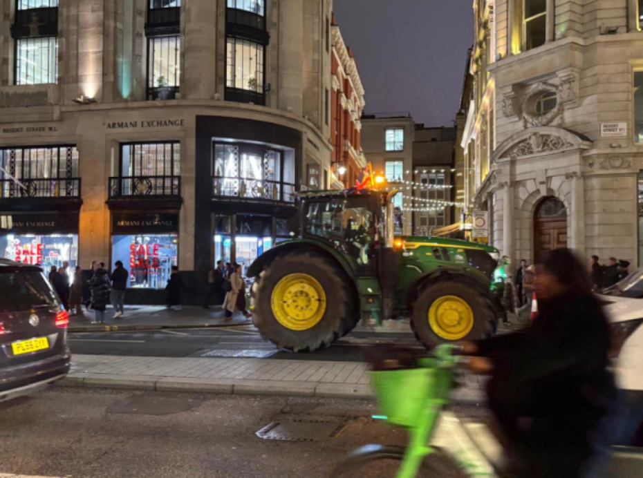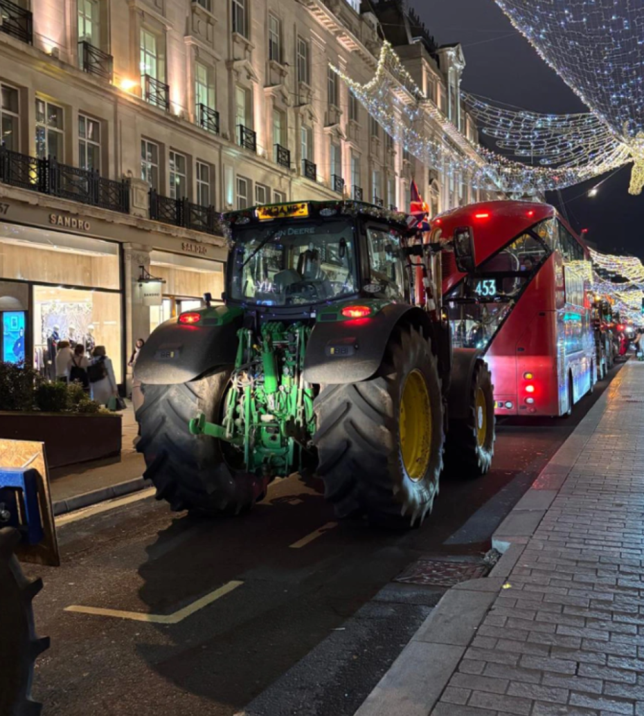 Pamje sureale ishin ato në Regent Street, një nga rrugët më ikonike të Londrës ku dhjetëra traktorë ndërprenë argëtimin e qindra qytetarëve e turistëve që vizitojnë këtë zonë elitare për të shijuar zbukurimet e fundvitit. Rreth orës 6 të mbrëmjes, traktorët u shfaqën midis turmës së njerëzve, duke bërë zhurmë të madhe me bori dhe muzikë.