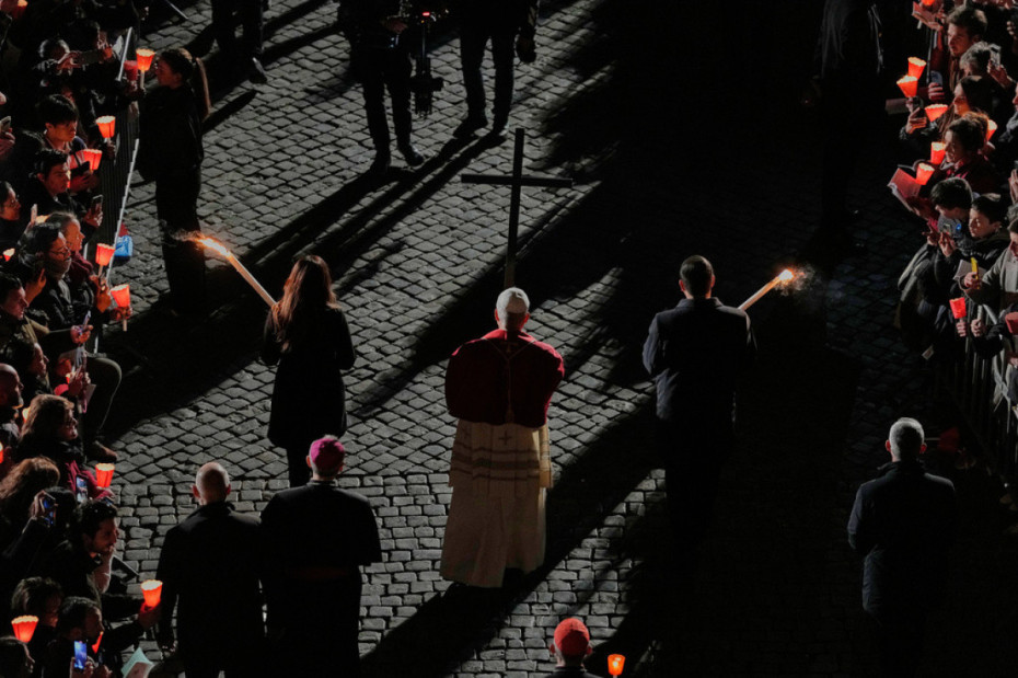 Nën dritën e qirinjve dhe i shoqëruar nga rreth 30,000 besimtarë, papa 70-vjeçar mbajti kryqin prej druri nëpër të gjitha 14 stacionet e Rrugës së Kryqit, në ndërtesën e lashtë romake, e cila ishte një vend martirizimi për shumë nga të krishterët e hershëm.