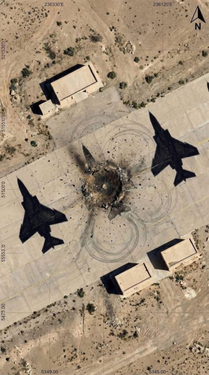 Raketat i goditën këto objektiva të rreme, pamjet satelitore të publikuara më vonë tregojnë kraterë shpërthimesh në asfalt pikërisht mbi vizatime, por aty nuk kishte mbetje të avionëve realë.