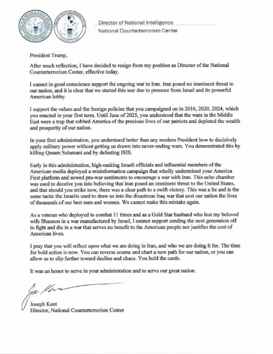 Në letrën e dorëheqjes drejtuar presidentit amerikan, Kent theksoi se në fillim të mandatit të dytë të Trump kishte paralajmëruar për një fushatë dezinformimi. Sipas tij “nisi një fushatë dezinformimi që minoi plotësisht platformën ‘America First’ dhe mbolli ndjenja pro-luftës për të inkurajuar luftën kundër Iranit”.