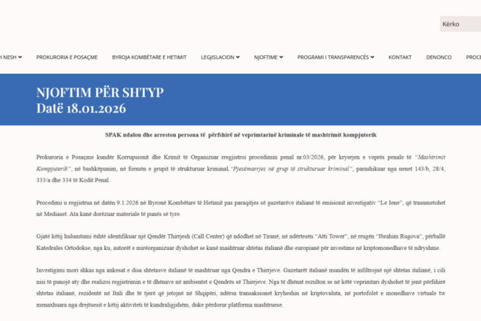 Prokuroria e Posaçme zhvilloi një operacion të gjerë kundër një rrjeti të dyshuar për mashtrim kompjuterik, të organizuar në formën e grupit të strukturuar kriminal, duke arrestuar 6 persona dhe duke sekuestruar qindra pajisje elektronike. Procedimi penal u regjistrua më 9 janar 2026, pas referimit të bërë nga gazetarët e emisionit investigativ “Le Iene”, të transmetuar në rrjetin italian të televizioneve “Mediaset”.