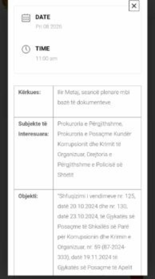 Sipas raportimeve, shqyrtimi i çështjes në Gjykatën Kushtetuese do të zhvillohet në bazë dokumentesh. Kjo do të thotë që ish-presidenti Meta nuk do të jetë i pranishëm fizikisht. Gjithashtu, nuk do të ketë as pjesëmarrje të përfaqësuesve të SPAK.