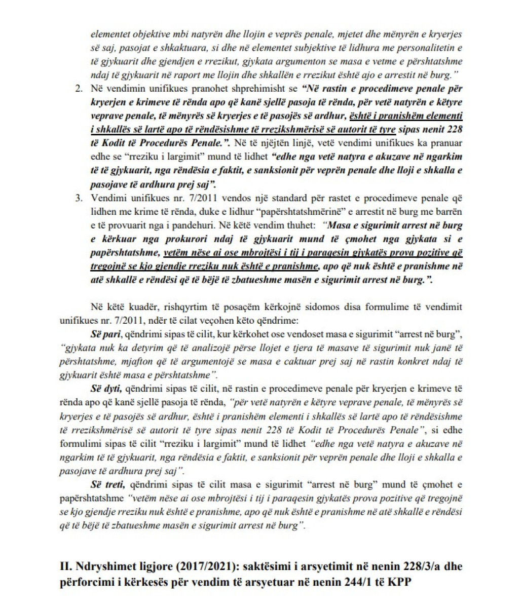 Një tjetër pikë e rëndësishme është kohëzgjatja e paraburgimit, ku sipas qasjes së re, për çdo zgjatje të masës “arrest me burg” gjykata duhet të japë argumente të reja, dhe jo të mbështetet vetëm te vendimi fillestar. Kjo nismë e Gjykatës së Lartë vjen në një kohë kur paraburgimet janë kthyer në një problem madhor në Shqipëri.