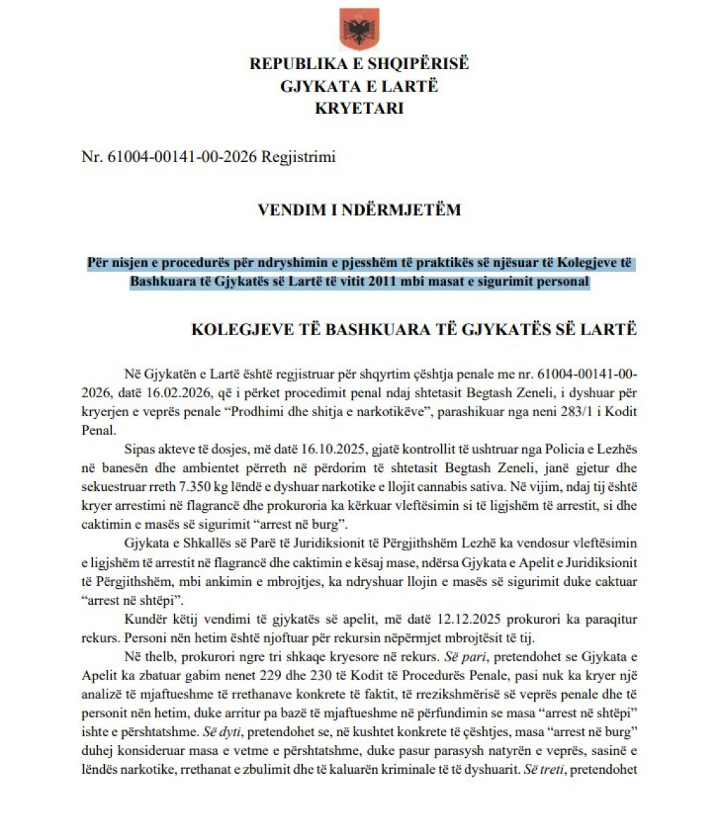 Gjykata e Lartë ka nisur zyrtarisht procedurën për rishikimin e praktikës gjyqësore mbi masën e sigurisë “arrest me burg” dhe kohëzgjatjen e saj, në një përpjekje për ta përafruar me standardet kushtetuese dhe ato të Konventës Europiane për të Drejtat e Njeriut. Prej orës 09:30 të mëngjesit, Kolegjet e Bashkuara të Gjykatës së Lartë janë mbledhur me iniciativë të kryetarit të institucionit, Sokol Sadushi.