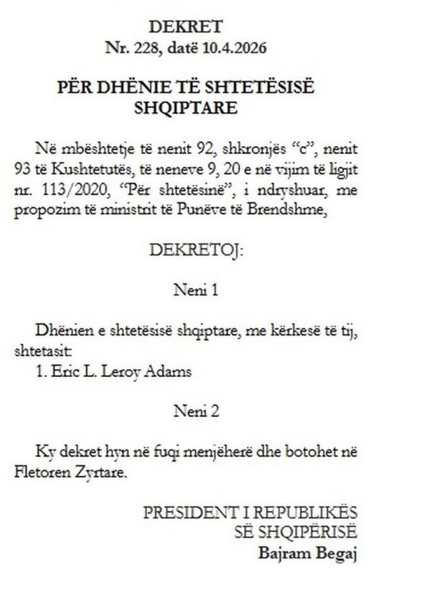 Në dekret theksohet se “Adams u pajis me pasaportë shqiptare me kërkesë të tij”, duke formalizuar kështu dhënien e shtetësisë për ish-zyrtarin amerikan. Ai e ka vizituar më parë Shqipërinë në tetor të vitit 2025, ku është takuar edhe me kryeministrin Edi Rama.