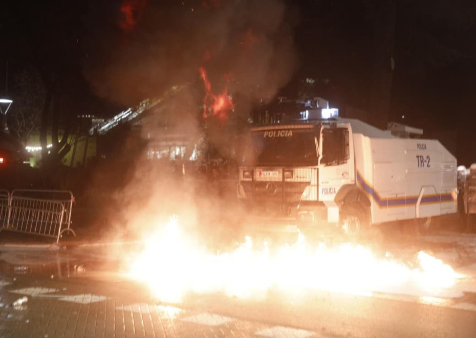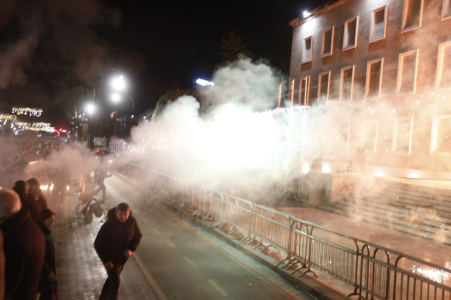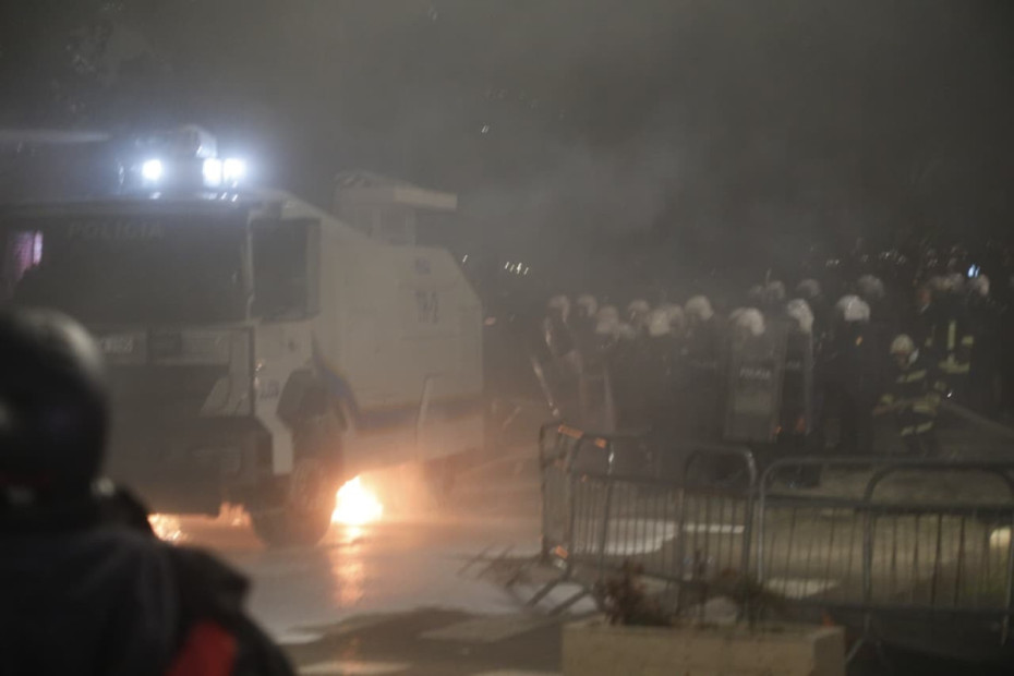 Protestuesit tek Parlamenti vijojnë të hedhin molotovë, teksa policia i është përgjigjur me gaz lotsjellës për t'i shpërndarë. Situata përshkallëzohet herë pas here mes efektivëve dhe protestuesve. Sheshi para parlamentit është boshatisur tashmë, teksa është nën mjegullën e krijuar nga gazi lotsjellës.