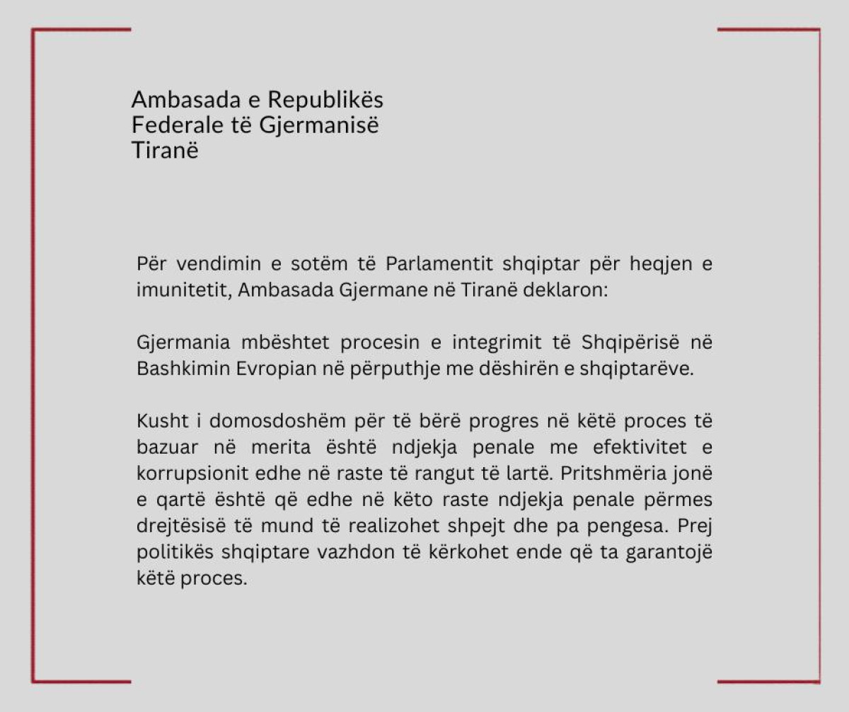Ambasada e Gjermanisë në Tiranë ka reaguar lidhur me vendimin e sotëm të Parlamentit shqiptar për çështjen e heqjes së imunitetit të ish-zv.kryeministres Belinda Balluku. Në një deklaratë, ambasada thekson se Gjermania mbështet procesin e integrimit të Shqipërisë në Bashkimin Europian, në përputhje me dëshirën e qytetarëve shqiptarë.
