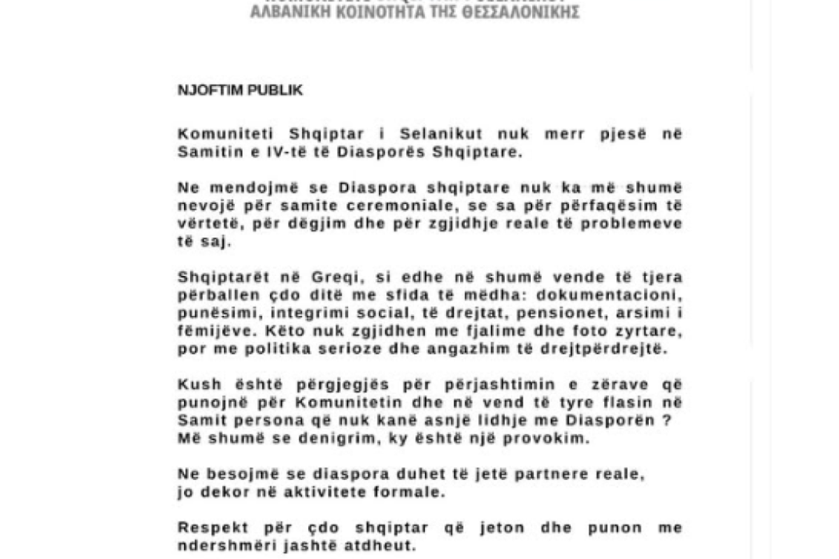 “Shqiptarët e Selanikut refuzojnë samitin e Ramës. Për ta Samiti i diasporës nuk po organizohet si forum i shqiptarëve jashtë atdheut, por si panair propagande për hallin politik të Ramës.