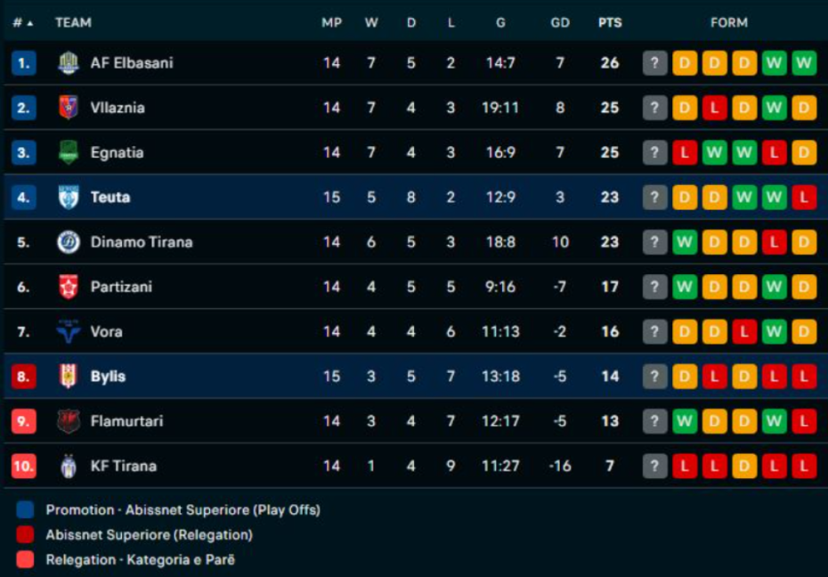 Pas këtij barazimi, Teuta ngjitet në kuotën e 23 pikëve dhe pozicionohet në vendin e katërt, ndërsa Bylisi me 14 pikë mban vendin e tetë.
