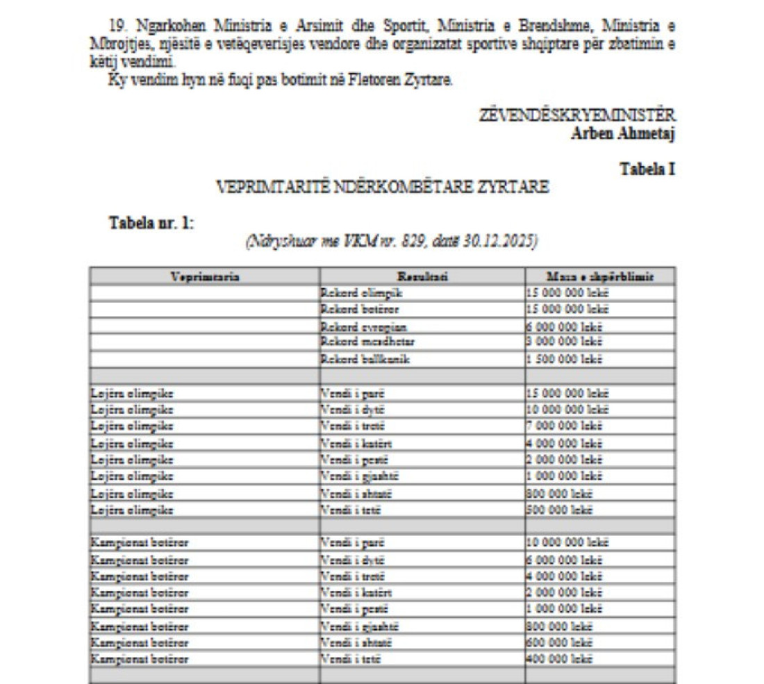 Goditja nga VKM-ja e ndryshuar erdhi si një goditje specifikisht për peshëngritjen, sport që vetëm në vitin 2025 i solli Shqipërisë 60 medalje ndërkombëtare. Për ta bërë edhe më absurd ndryshimin e paparalajmëruar në shpërblimet për sportin, dokumenti mban emrin e ish-zv.kryeministrit Arben Ahmetaj, i cili prej korrikut 2023 është në arrati, pasi kërkohet nga drejtësia për “shpërdorim detyre” në lidhje me inceneratorët e Fierit dhe Elbasanit.