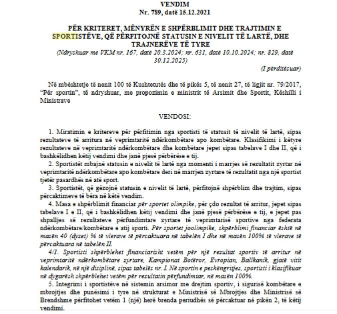 Bazuar “në kriteret për mënyrën e shpërblimit dhe trajtimit të sportistëve që përfitojnë statusin e nivelit të lartë”, në pikën 4/1 përcaktohet se: “Sportisti shpërblehet financiarisht vetëm për një rezultat sportiv të arritur në veprimtaritë ndërkombëtare zyrtare si Kampionat Botëror, Europian e Ballkanik”.
